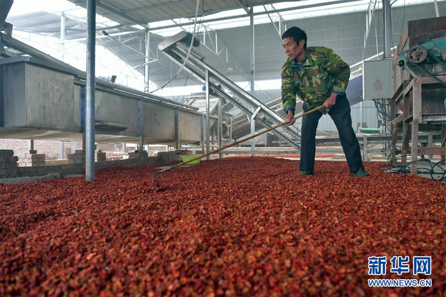 在夺火乡高谷堆村,村民在晾晒山楂片(10月14日摄)。