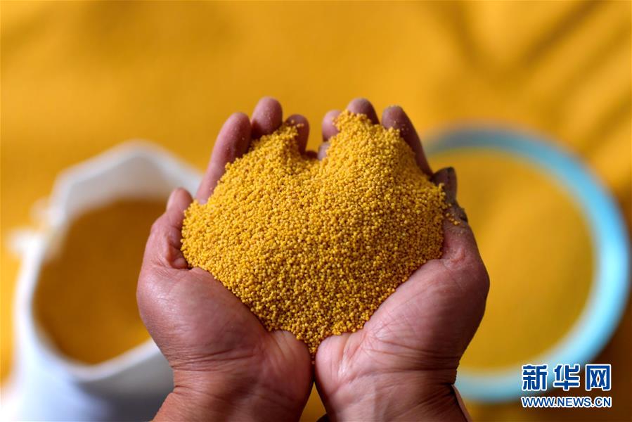 在夺火乡高谷堆村,村民展示收获的小米(10月14日摄)。