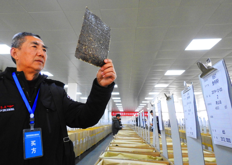 1月4日,江苏省连云港市举办2020年度首场紫菜交易会,106家紫菜加工企业提供65415箱、共计3.13亿张干紫菜入场销售,吸引众多中外客商到场选购交易。近年来,连云港紫菜养殖规模逐年扩大,紫菜养殖、加工、销售成为当地渔业转型发展的支柱产业。新华社发(耿玉和 摄)