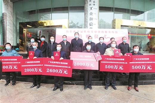 2月7日,自治区新冠肺炎疫情防控工作领导小组指挥部举行捐赠活动,24家企业现场捐赠款物价值超过1亿元,用于疫情防控工作。 本报记者 何学俏/摄