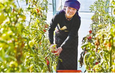 3月2日,在西藏日喀则市白朗县巴扎乡,查吾冲村村民次仁片多在蔬菜大棚里采摘西红柿。次仁片多工作的蔬菜基地,占地总面积1087亩,共有119座大棚,是白朗县国家级蔬菜标准化生产示范区的新成果。