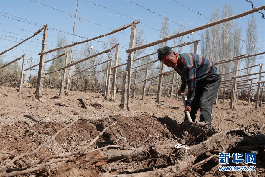4月7日,在敦煌市郭家堡镇七号桥村,村民将埋了一个冬天的葡萄藤从地里挖出来,准备上架。