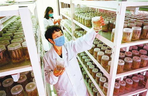 张北县德胜村大农种业公司无菌育种室,技术人员在检查马铃薯瓶苗的长势。“德胜马铃薯”已成为当地知名农产品品牌。
