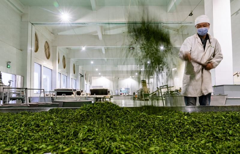 4月25日,工人在秭归县九畹丝绵茶扶贫车间对茶叶鲜叶进行摊凉。