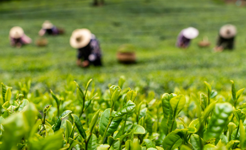 4月25日,在秭归县九畹溪镇峡口村九畹丝绵茶生态基地,村民在采摘茶叶。