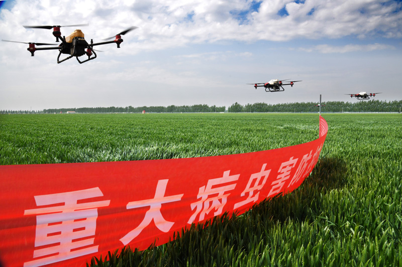 近日,山东省全面进入冬小麦抽穗、扬花关键时期,各地农业、农机部门加强田间地头的病虫害防治工作,通过病虫害远程智能监测系统、植保无人机等现代农业技术和设施,全力保障小麦丰收。新华社记者 李紫恒 摄