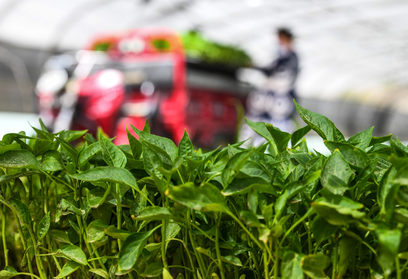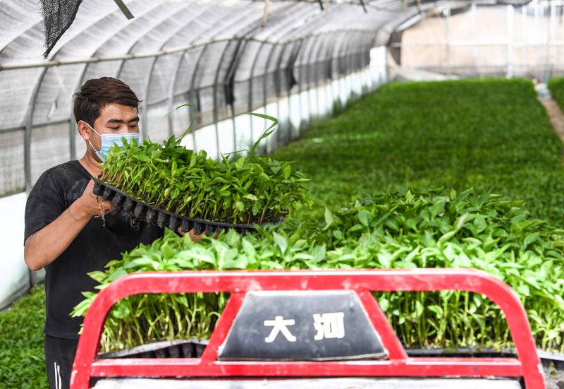 农民在位于新疆和田县塔瓦库勒乡巴克墩村的辣椒育苗基地大棚搬运辣椒苗(5月16日摄)。新华社记者 王菲 摄