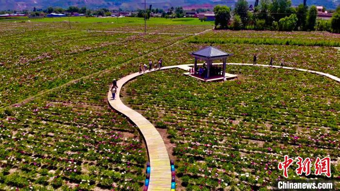 图为游客在临夏州临夏市枹罕镇江牌村芍药基地,观赏美景。临夏州委宣传部供图